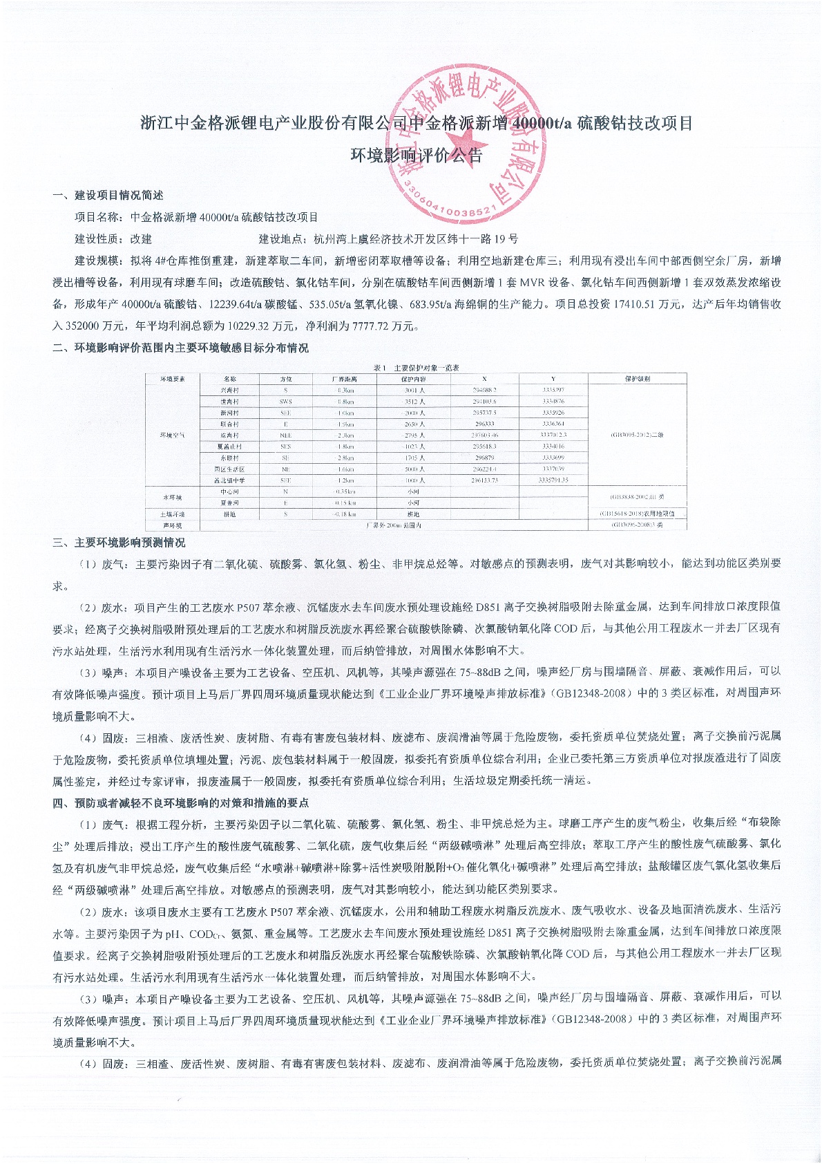 浙江中金格派鋰電產業股份有限公司中金格派新增40000t/a硫酸鈷技改項目 環境影響評價公告